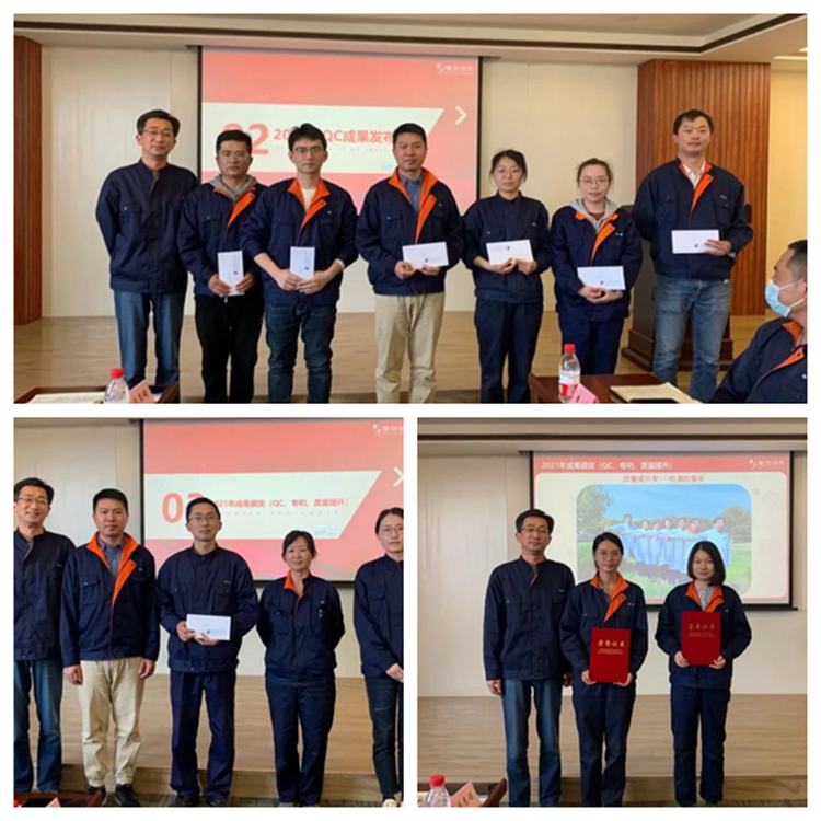 会议对2021年度质量提升和技术创新突出人员进行了表彰,品质部检测小组获“检验质量奖”,生产分厂包装小组获“生产质量奖”,张桂英、吴福东等人获“创新点子奖”,王文飞等4人获“专利申报奖”。会议现场发布了2021年QC成果,经打分评选出一、二、三等奖各1名,优秀奖3名。
