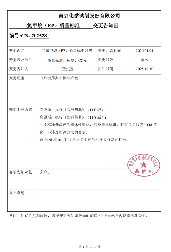 南京试剂-二氯甲烷EP标准由11.0版升级为11.8版,此次标准升级仅为描述性变化,不涉及方法的变化;12月31日之前的批次仍执行旧版。变更告知函请注意查收!