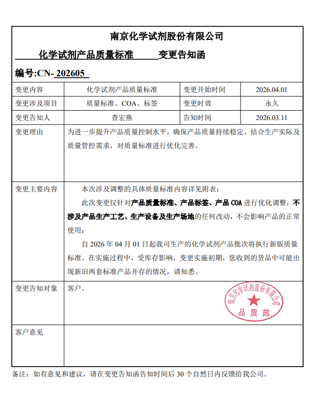 自 2026 年 04 月 01 日起我司生产的化学试剂产品批次将执行新版质量标准。在实施过程中,受库存影响,变更实施初期,您收到的货品中可能出现新旧两套标准产品并存的情况,请知悉。