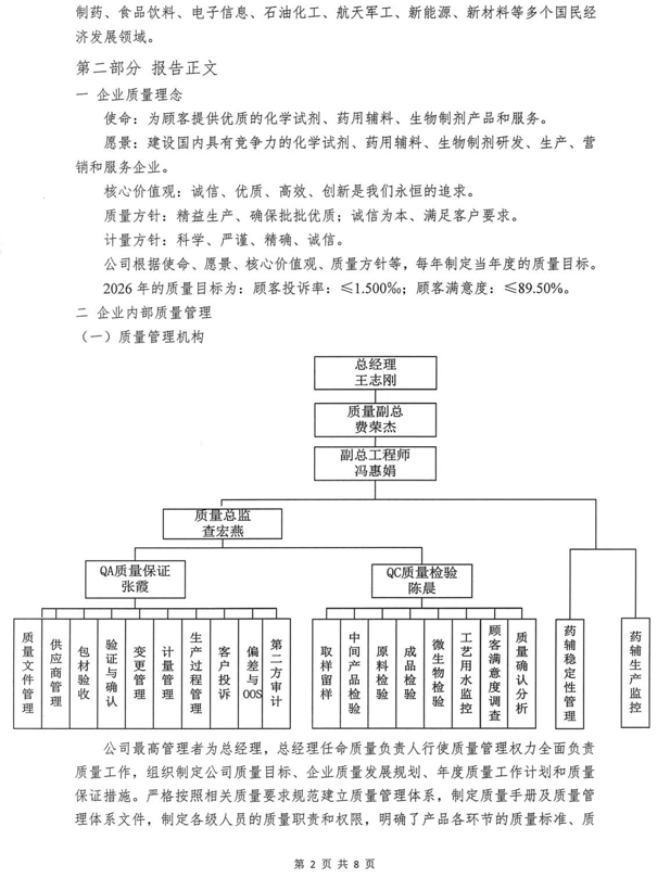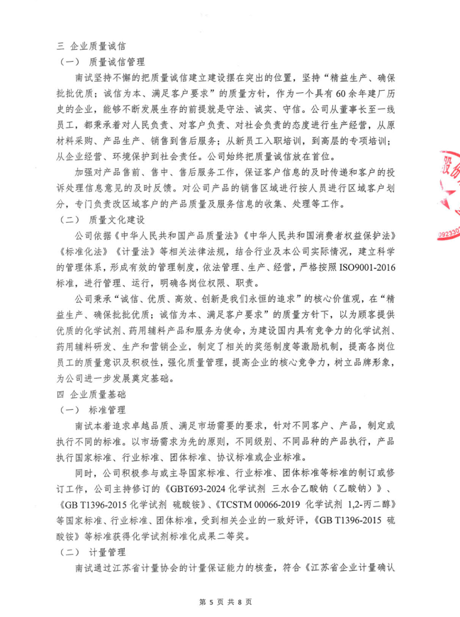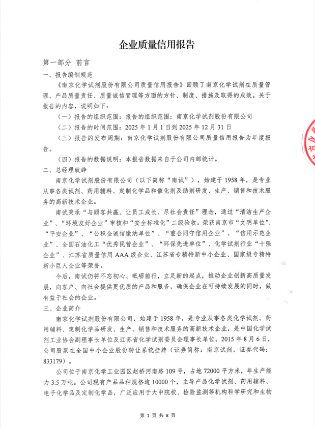 第一部分 前言 企业质量信用报告 一、报告编制规范 《南京化学试剂股份有限公司质量信用报告》回顾了南京化学试剂在质量管 理、产品质量责任、质量诚信管理等方面的方针、制度、措施及取得的成效。