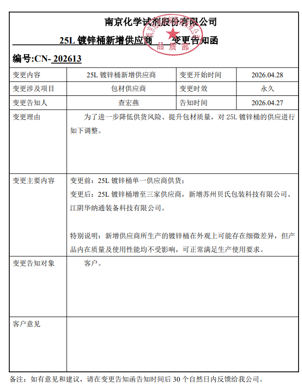 为了进一步降低供货风险、提升包材质量,南京化学试剂股份有限公司对25L 镀锌桶的供应进行如下调整。
